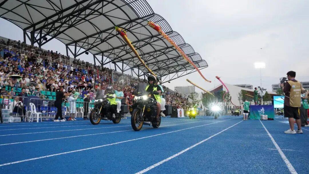十三名铁骑,身姿挺拔如松,驾驭机车风驰电掣绕场而行,身后鞭龙迎风招展,似金鳞闪烁、游龙戏空!每一道鞭影都在诉说:江都精神,既在龙狮鼓的奔腾中激昂,也在铁骑的巡行中永恒!